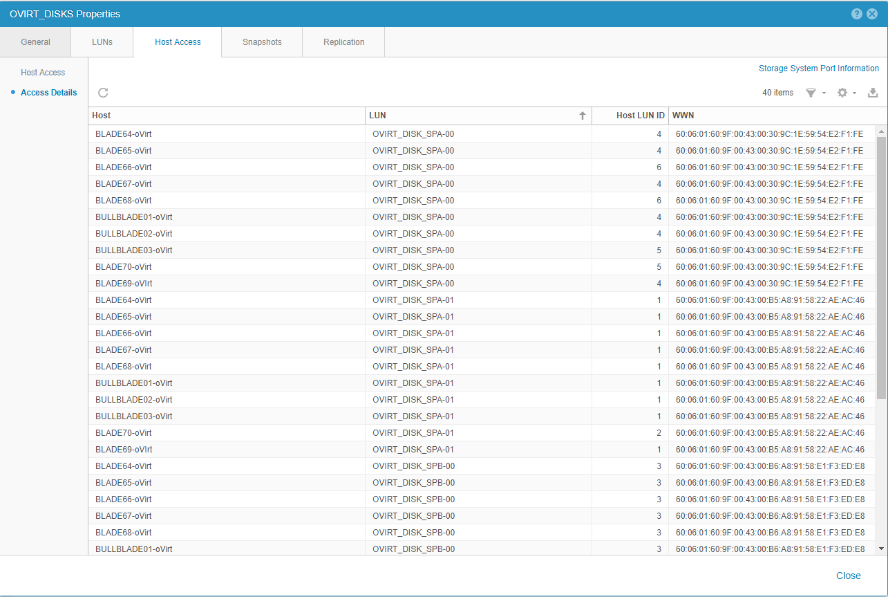 Lo que me extraña un poco, en el Consistency Group OVIRT_DISKS, es que los Host LUN IDs no son los mismos para cada LUN y cada uno de los servidores que acceden a estas LUNs. La recomendación de rendimiento es que todos los servidores mantengan el mismo Host LUN ID para cada LUN; de esta manera, todos los host que acceden a la LUN OVIRT_DISK_SPA-00 tienen que tener configurado el Host LUN ID a 4; para la LUN OVIRT_DISK_SPA-01, el Host LUN ID a 1; OVIRT_DISK_SPB-00 a 3 y para OVIRT_DISK_SPB-01 a 2.